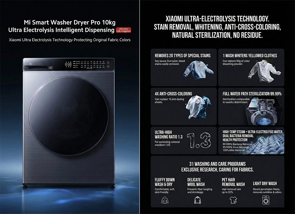 Theo Xiaomi, công nghệ “siêu điện phân” trong máy giặt này được cho là có khả năng loại bỏ 20 loại vết bẩn cứng đầu như nước ép trái cây, nước tương và nước sốt.