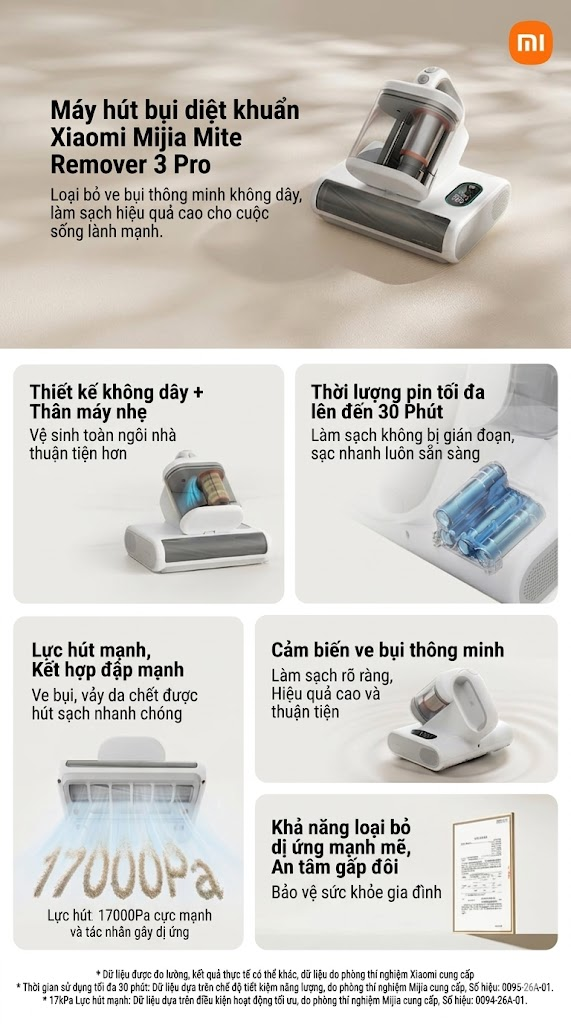 Mijia Mite Remover 3 Pro là một bản nâng cấp đáng kể so với các phiên bản trước, tập trung vào tính tiện dụng và hiệu suất mạnh mẽ. Cải tiến đáng chú ý nhất là lực hút mạnh mẽ 17.000Pa nhờ nâng cấp sức mạnh động cơ không chổi than (thế hệ cũ có lực hút 14.000 Pa). Lực hút này kết hợp với hệ thống rung tần số cao hoạt động ở tốc độ 72.000 nhịp/phút đảm bảo các chất gây dị ứng nằm sâu bên trong nệm và đồ nội thất được hút sạch hiệu quả. Đầu hút rộng 20cm giúp bao phủ hiệu quả các bề mặt lớn như giường, ghế sofa và thảm.